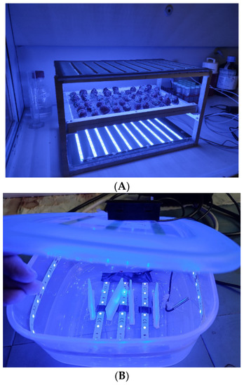 (A) On the left, the bigger structure was created to illuminate a maximum of 0.25 kg of berries with blue LED after curcumin spraying; berries were placed on the mid-frame grid, irradiated from both above and below. The structure was placed under a hood to avoid heating the berries during the three hours of illumination. (B) On the right, the smaller structure for in vitro experiments or a small number of berries can be seen. A Petri dish could be inserted on the supports to illuminate, from all the directions, berries or bacterial colonies.