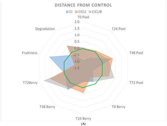 The two principal components were F1 (sensors: W1C, W3C, W6S, W1W, W2W, and W3S) and F2 (sensors: W5S, W5C, W1S, and W2S). A practical sense of these two components can be assigned, as in [40] in a similar case. F1 was widely impacted by methane, ammonia, and breath gases, so it indicated the “degradation” of berries. F2 recognized esters, i.e., the natural odor of berries, so it denoted “fruitiness”. These definitions are used in the radar graph (Figure 3A,B).