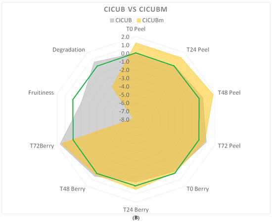 (A) (Top) Radar graph for CI (blue area), CICU (red area), and CICUB (grey area) in respect of CTR (green line). Both blueberries and strawberries were considered. All the points outside the green line indicate better behavior in respect of CTR, while inner points indicate worse behavior. (B) (Bottom) Radar graph for CICUB (grey area) and CICUBm (orange area) in respect of CTR (green line). All the points outside the green line indicate better behavior in respect of CTR, while inner points indicate worse behavior.