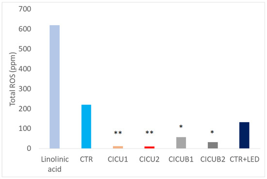 Oxidative stress in the five standard berry groups (CTR, CICU1, CICU2, CICUB1, and CICUB2; see Table 1) compared with the standard control (linolenic acid) and berries + blue LED. Both the treatments (grey bars, i.e., CICUB at 0.5 and 1 mg/mL) reduced the oxidative stress in respect of controls. Legend: * = significant difference, p < 0.05; ** = major significant difference, p < 0.0001; no marks = not significant.