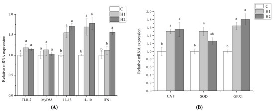 As revealed in Figure 1, the addition of HMX2-EPS had no significant effect on the expression of TLR-2 and MyD88 (p > 0.05). However, the gene expression of 1L-1β and 1L-10 in H1and H2 groups was significantly higher than that in the C group (p < 0.05), and the expression of IFN1 in the H2 group was the highest and significantly higher than that in the H1 and C groups (p < 0.05). Compared with the control group, the gene expression of CAT, SOD, and GPX1 was upregulated in the HMX2-EPS groups (p < 0.05). It showed that the addition of large doses of HMX2-EPS could enhance non-specific immunity and antioxidant capacity.
