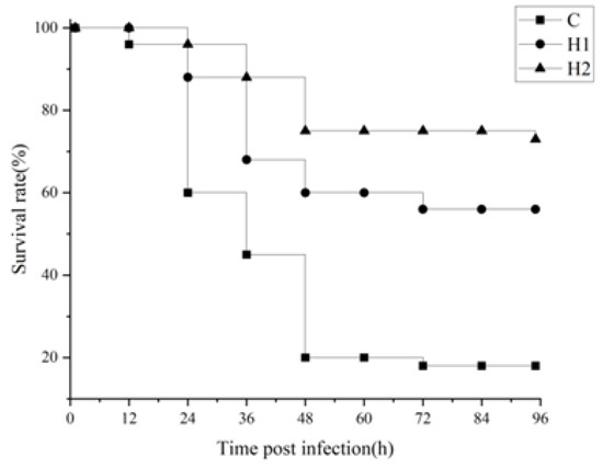 Different doses of HMX2-EPS could improve the survival rate of juvenile turbot after being poisoned by A. hydrophila (Figure 2). The highest survival rate was in the H2 group, which maintained 75% after 48 h, while the survival rate of juvenile turbot in the control group was only 20%.