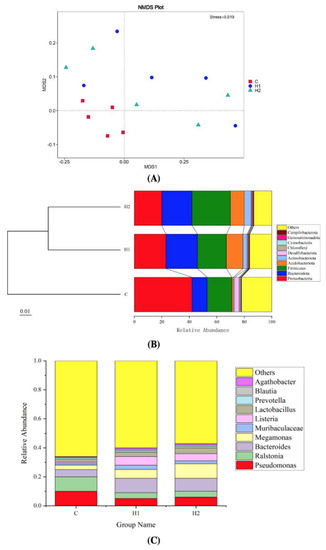 As shown in Figure 3A, the beta diversity analysis, according to the nonmetric multidimensional scaling (NMDS), showed that there was a difference between the C, H1, and H2 groups (stress = 0.019). The clustering results are presented at the phylum level (Figure 3B). H1 and H2 groups were clustered into a branch and then clustered with the C group into a branch. The results showed that the species composition structure of the H1 group and H2 group was similar, and the diversity of flora was higher than that of the C group.