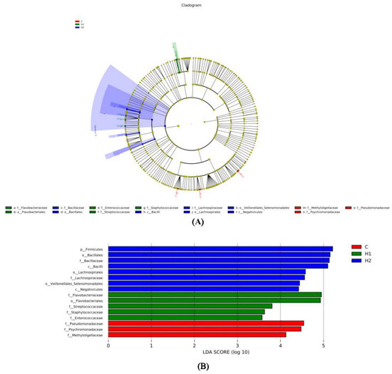 Linear discriminant analysis effect size (LEfSe) analysis of the gut microbiota fed with HMX2-EPS supplementation diets (p ≤ 0.05 and linear discriminant analysis (LDA) cut-off > 4) (n = 6). (A): Cladogram showing differences in the abundance of taxa; (B): linear discriminant analysis scores of the abundance of taxa. C, 0 mg/kg; H1, 100 mg/kg; H2, 500 mg/kg.