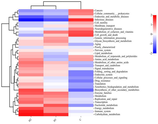 Heatmap of microbial functions at the second level (subfunction in each major type of metabolic pathway) of juvenile turbot. C, 0 mg/kg; H1, 100 mg/kg; H2, 500 mg/kg.