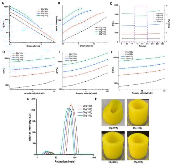 Effect of starch content on the rheological properties (A–F): (A) viscosity (ƞ); (B) shear stress; (C) shear recovery behavior; (D) elastic modulus (G′); (E) viscous modulus (G″); (F) complex modulus (G*)); (G) water mobility of lemon juice–starch gel (LJSG); (H) 3D-printed hollow cylinders. The reported data are the average results of the samples analyzed three times.