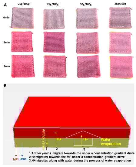 The dual-nozzle 3D printing technology can create a stacked structure with multiple food materials. When there is a difference in solute concentration between two food materials, this difference will gradually disappear with the migration of water and solutes over time (or accelerated by heating). Anthocyanins are natural pigments that have antioxidant, antiaging, and anticancer properties. Anthocyanins have different molecular structures and colors at different pH levels []. Based on this property of anthocyanins, a stacked structure consisting of two parts was constructed in this experiment: The upper part contained MPs with anthocyanins (response part), and the lower part contained LJSG (pH stimulus layer). Concentrated lemon juice was chosen in the experiment because of its acidic property and yellow color, which is a naturally acidic food. In addition, concentrated lemon juice is often used as an ingredient in desserts and can be used to make a product similar to juice gummies after adding starch, which has a high consumer acceptance.