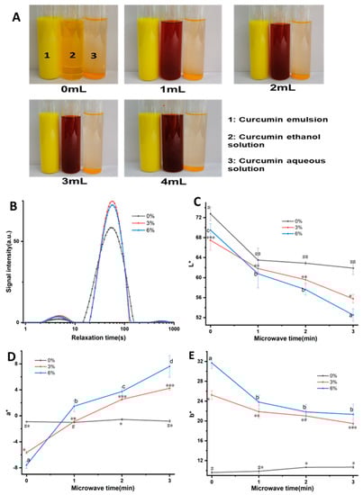 Test of embedding effect of curcumin emulsion (A); water mobility of mashed potatoes with different concentrations of curcumin emulsion (B); effect of curcumin emulsion on the color change in samples during microwave post-treatment (C–E). The different lowercase letters and “*”, “**”, “***”, “#”, “##” means the significant difference.