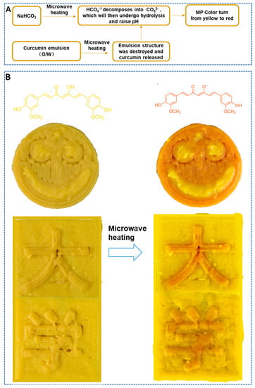 Mechanism of color change in 3D printed MPs during post-microwave treatment (A); microwave-triggered pH induced color change in curcumin-containing printed samples (B).