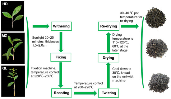 Huang Dan stir-fried green tea (HD) and Meizhan stir-fried green tea (MZ) were produced by Jiexi Yidao Pharmaceutical Co., Ltd. (Jieyang, China), and Qingliang Mountain stir-fried green tea (QL) was produced by Runqi Cultural Technology Development Co., Ltd. (Meizhou, China). HSGT was produced according to a standard procedure (GB/T 14456.1-2008): each of the samples was subjected to withering, fixing, roasting, twisting, drying, and re-drying during the harvest season of September 2020 (Figure 1). The experiment was conducted with three biological replicates.