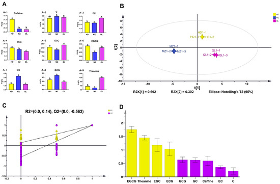 Multivariate statistical analysis of the non-volatile components in the three HSGTs. (A) The contents of theanine, catechin and caffeine were measured by high-performance liquid chromatography (HPLC). Different letters indicate statistically significant differences according to one-way ANOVA with Tukey’s post-hoc test; (B) OPLS-DA score plot; (C) cross-validation results: the intercept of the Q2 regression line of the cross-validation model with 200 tests of alignment was less than 0, indicating that the OPLS-DA discriminant model was not over-fitted and the model was relatively reliable. (D) VIP score plot, where yellow bars represent non-volatile compounds with VIP > 1 and purple bars represent those with VIP < 1.