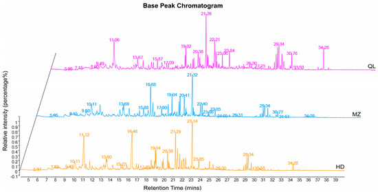 To investigate the differences in the volatile components of HD, MZ and QL, the 60 volatile components were quantified (Table S3). In addition, base peak chromatography (BPC) using GC-MS was conducted. The BPC analysis revealed that all samples exhibited prominent signal detection by mass spectrometry, broad peak capacity, and remarkable separation efficiency (Figure 3). We also used cluster analysis to draw heatmaps and divided them into three main parts based on the major up-regulated volatiles in HSGT made from each variety (Figure S1). The compound with the highest concentration was dihydrolinalool (443.92 ± 33.06 µg/kg), followed by indole (404.5 ± 31.14 µg/kg) and nerolidol (346.78 ± 25.54 µg/kg), which together putatively provide a wood, fruity, and floral aroma. Dihydrolinalool had the third-highest concentration in MZ and the second highest in QL. β-Ionone, which has a floral, sweet aroma, was the most abundant volatile in both MZ (609.74 ± 2.78 µg/kg) and QL (222.42 ± 10.38 µg/kg). In addition, linalool, geraniol, jasmone, and geranylacetone, were abundant in HD, which coincided with the characteristic floral aroma of HD. In MZ, benzaldehyde, β-cyclocitral, 1,2-dihydro-1,1,6-trimethylnaphthalene, and other fruity and woody flavors were abundantly concentrated. Although QL had the greatest variety of aromas, the overall concentration of volatiles was not as high as those in HD and MZ, which may have affected the intensity of its aroma. The above results suggested that differences in the proportion and concentration of volatile components may have contributed to the different aromas of the three HSGTs.
