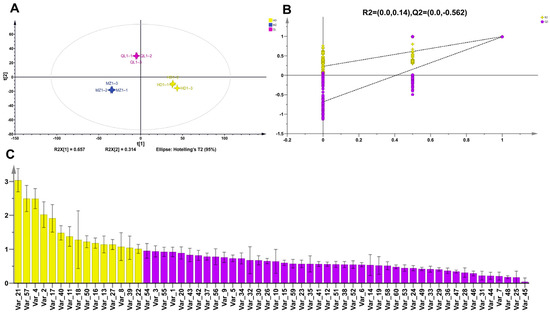 Multivariate statistical analysis of volatile components in the three HSGTs. (A) OPLS-DA score plot; (B) cross-validation results: the intercept of the Q2 regression line of the cross-validation model with 200 tests of alignment was less than 0, indicating that the OPLS-DA discriminant model was not over-fitted and the model was relatively reliable. (C) VIP score plot: yellow bars represent non-volatile compounds with VIP > 1; purple represents VIP < 1.