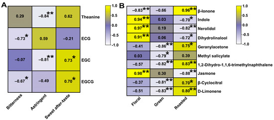 Correlation analysis of sensory evaluation of HSGTs with characteristics: (A) taste and (B) aroma compounds. Statistical significances are denoted by * for p < 0.05 and ** for p < 0.01.