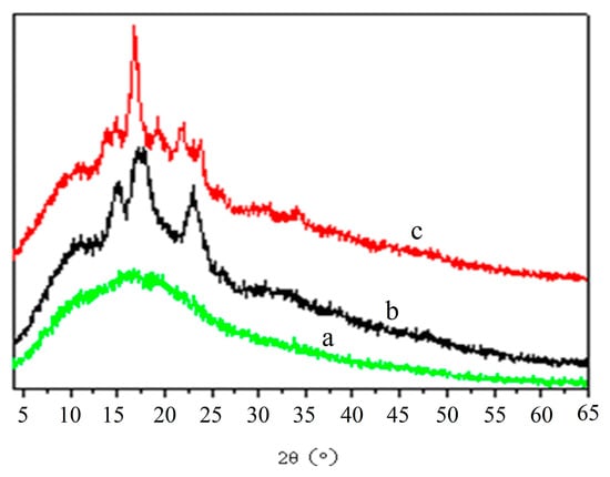 X-ray diffraction molds of raw and treated starches. a indicates buckwheat starch; b indicates resistant starch prepared using the acid hydrolysis method; c represents resistant starch prepared using the autoclaving enzymatic debranching method.