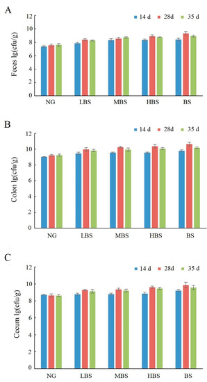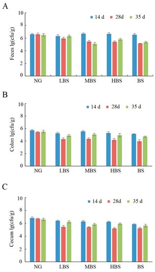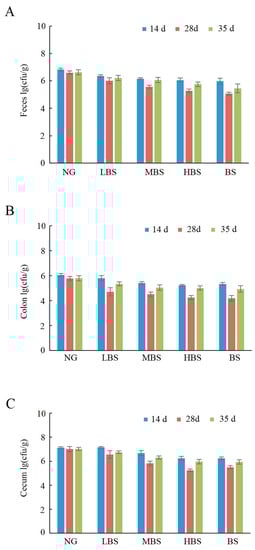 The quantity of Citrobacter in the LBS, MBS, HBS, and BS groups was reduced in the colon and cecum tissues, as well as feces at 28 and 35 days compared with negative control (without gavaged of any types of starch). Compared with gavaged buckwheat starch, being gavaged with different dosages of buckwheat resistance starch could increase the quantity of Citrobacter in the colon and cecum tissues at 14, 28, and 35 days (Figure 3).