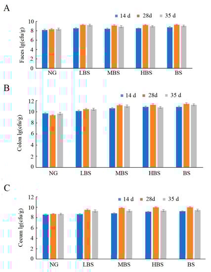 The effects of buckwheat resistance starch on the quantity of Bifidobacterium on feces (A), colon (B), and caecum (C). NG: negative control group; BS: buckwheat starch group; LBS: low dosage of buckwheat resistance starch group; MBS: middle dosage of buckwheat resistance starch group; HBS: high dosage of buckwheat resistance starch group.