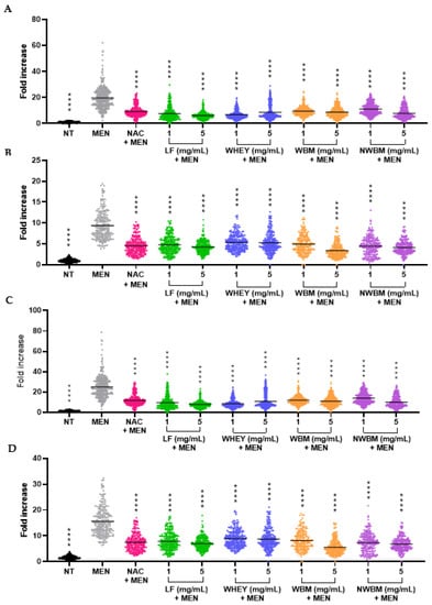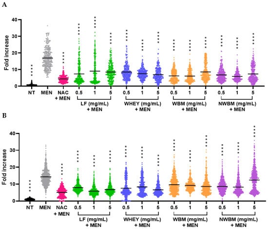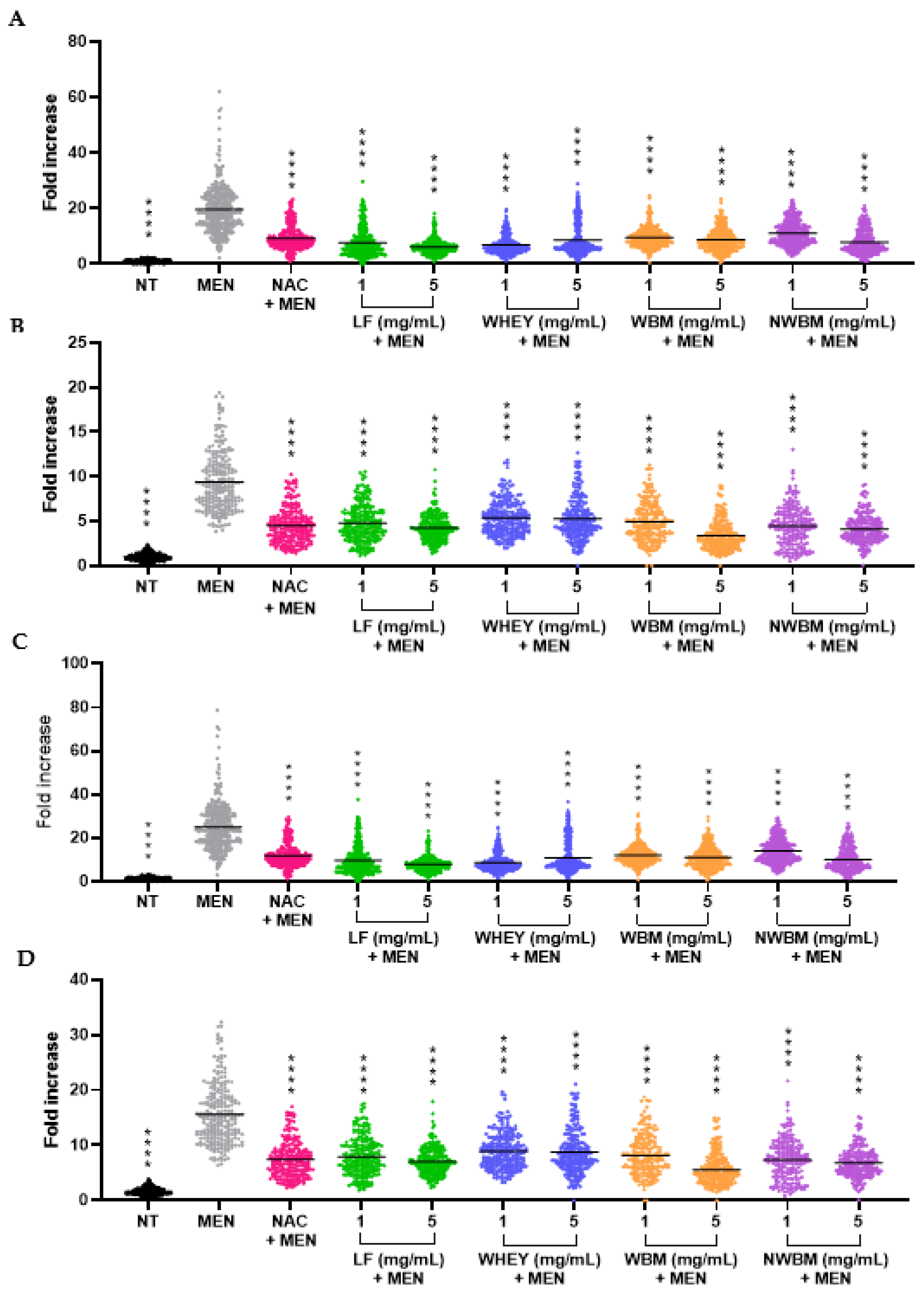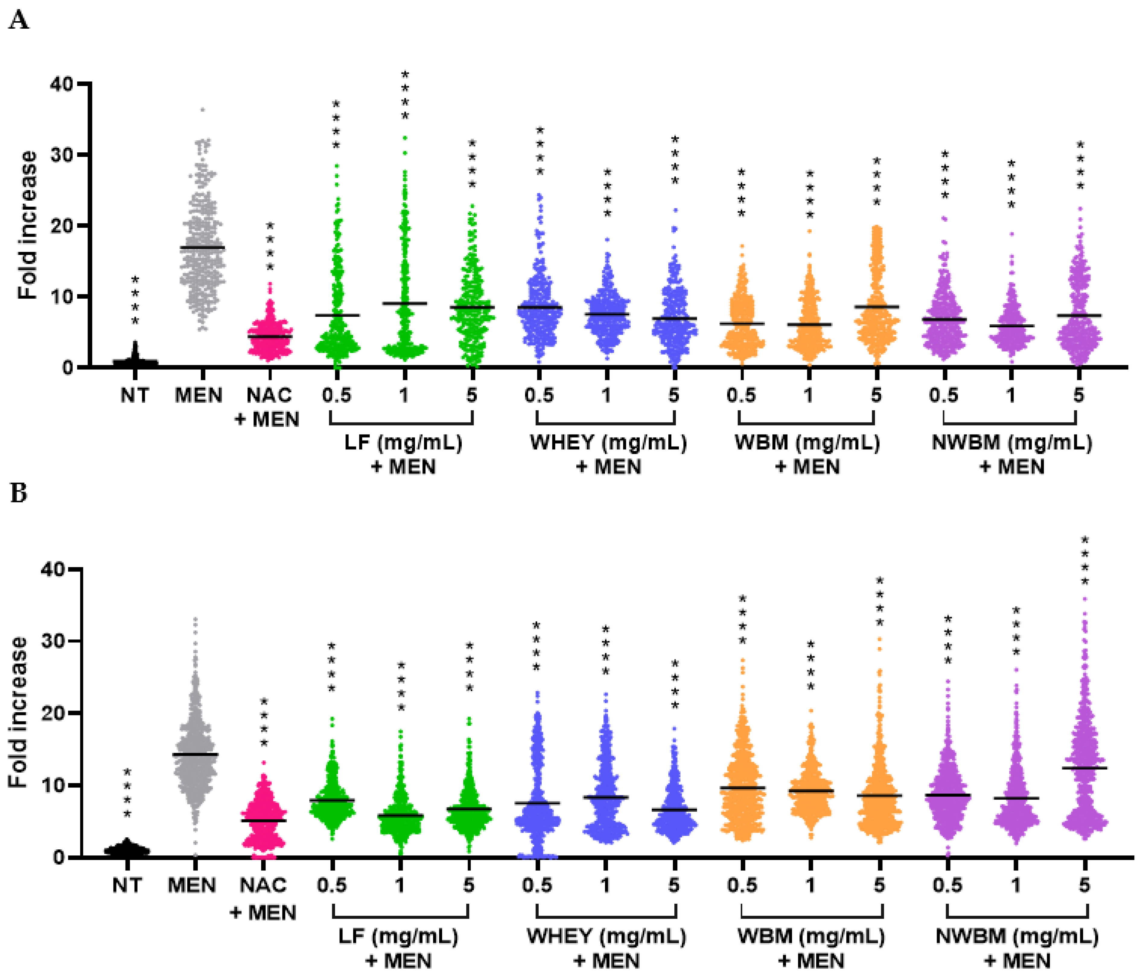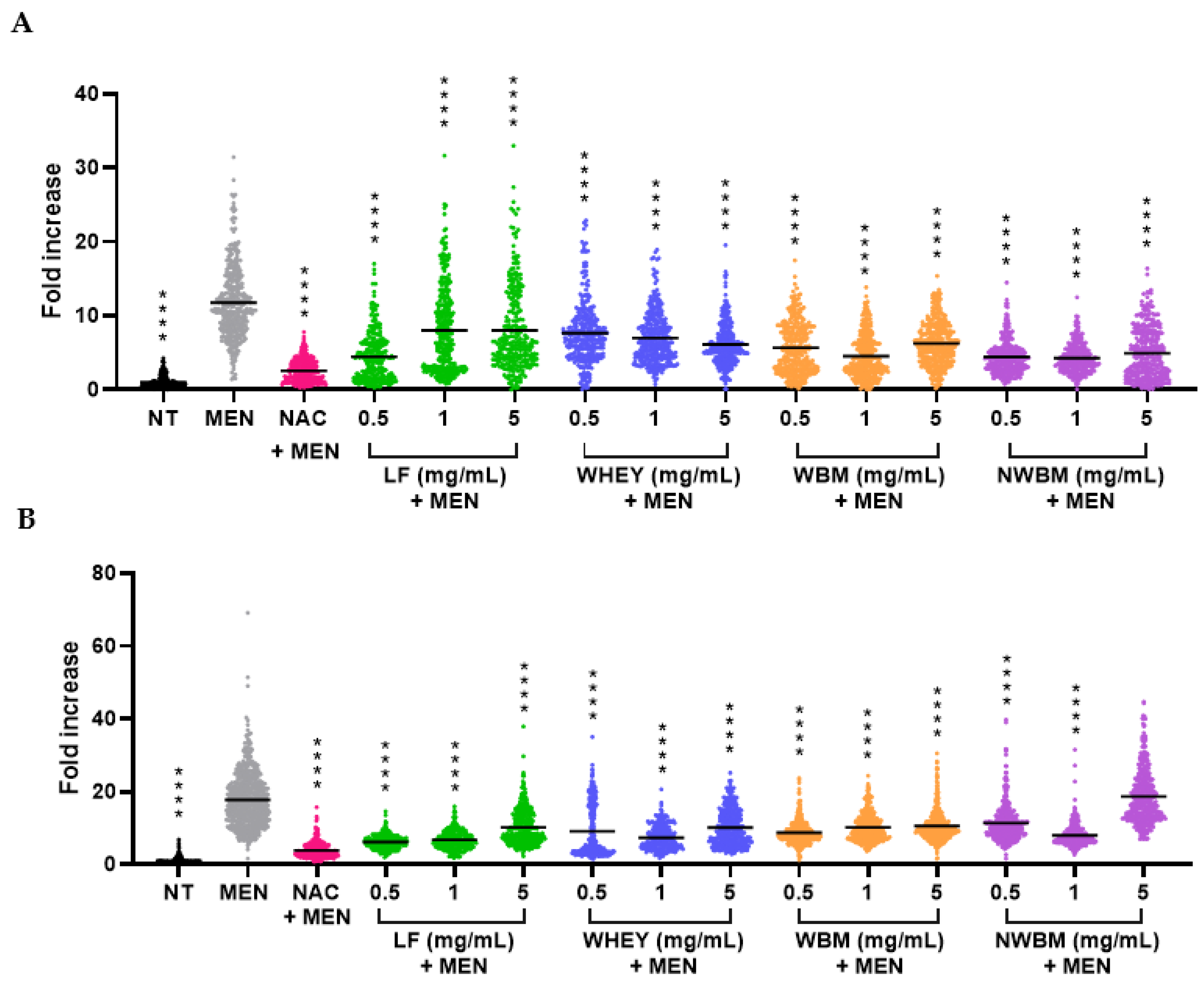 Effect of dairy fractions on oxidative stress caused by menadione on (A) Caco-2 and (B) HepG2 cells. NT: non-treated cells. MEN: positive control of oxidative stress, cells treated with 50 µM menadione for 1 h. NAC + MEN: cells treated for 1 h with 1 mM NAC as a control of antioxidant effect before menadione treatment. LF: lactoferrin. WBM: washed buttermilk. NWBM: non-washed buttermilk. The results were normalized to 1 for the untreated condition. The values represent the intensity of 150–200 cells counted in each experiment, on three independent experiments. The bars represent the means of all counts. **** p < 0.0001, compared with MEN.