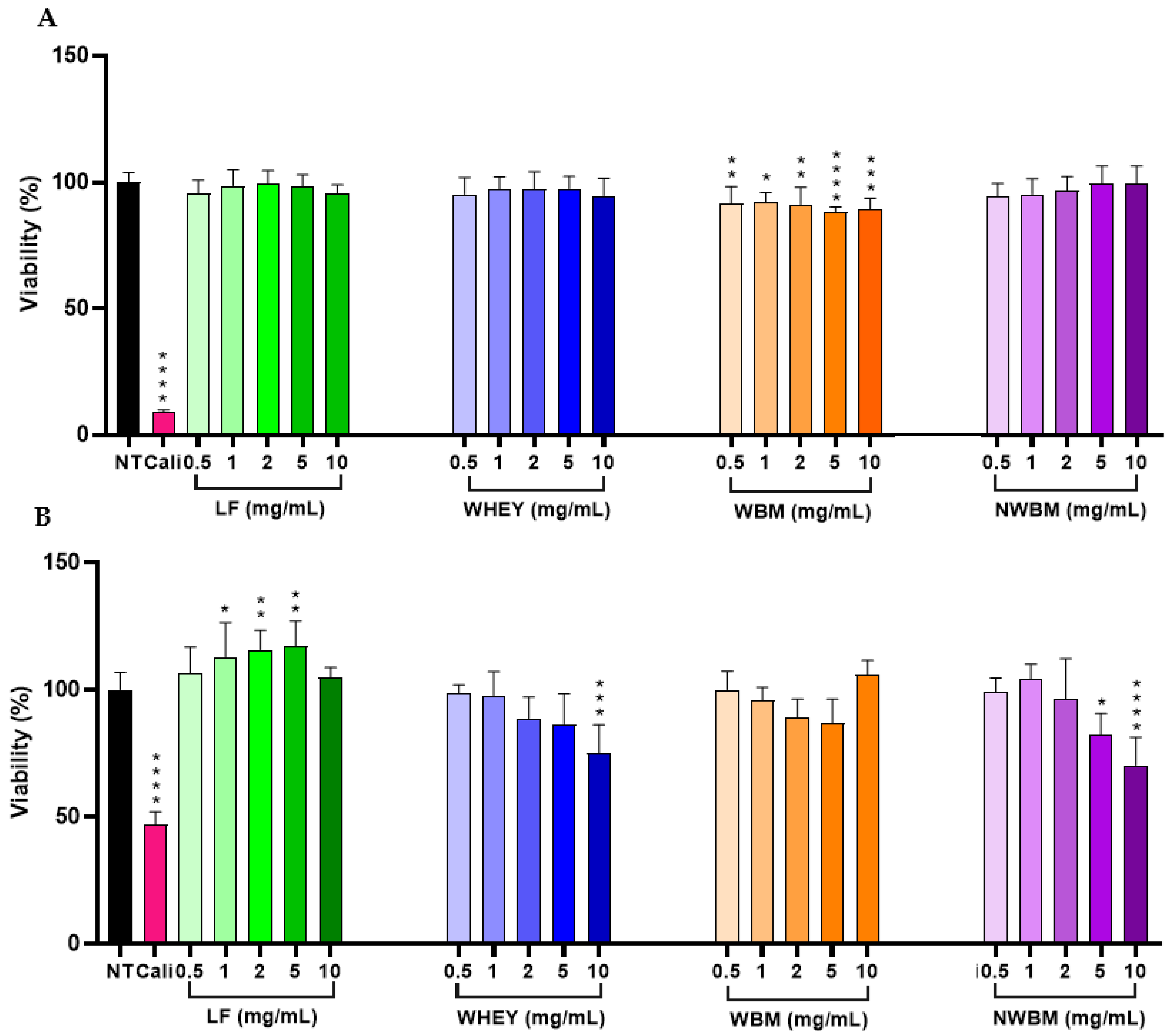 The results obtained showed that LF, whey, and non-WBM did not affect the Caco-2 cells viability when incubated for a maximum of 24 h. However, WBM induced some cell toxicity, although without going below 88% viability (Figure 1A).