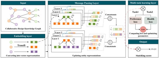 The overall framework and operation process of the model is introduced below. The framework of the healthy food recommendation model is illustrated in Figure 2, which consists of three components: (1) the embedding layer, which vectorizes each entity and relation in into a vector through knowledge graph embedding; (2) the message passing layer, which utilizes a knowledge-aware attention graph convolutional neural network to perform iterative updates on the vector representation of each entity by receiving messages from its neighborhood; and (3) the multi-task learning layer, performing the preference learning task and health learning task, respectively.