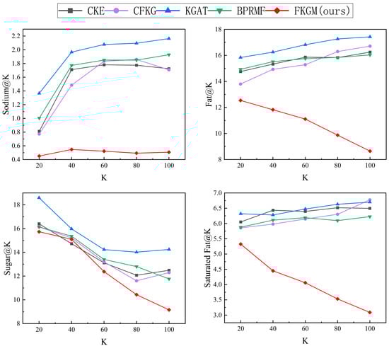 Table 7 shows the performance of and four baseline models in terms of the preference evaluation metric Recall@20 and four health evaluation metrics. The analysis shows that although did not achieve an optimal performance in dietary preference recommendation, it outperformed other models that only focus on preferences in terms of meeting user health requirements. A further analysis of the comparison between and other models in terms of health recommendation with the ranking parameter set to {20, 40, 60, 80, 100} is shown in Figure 4.