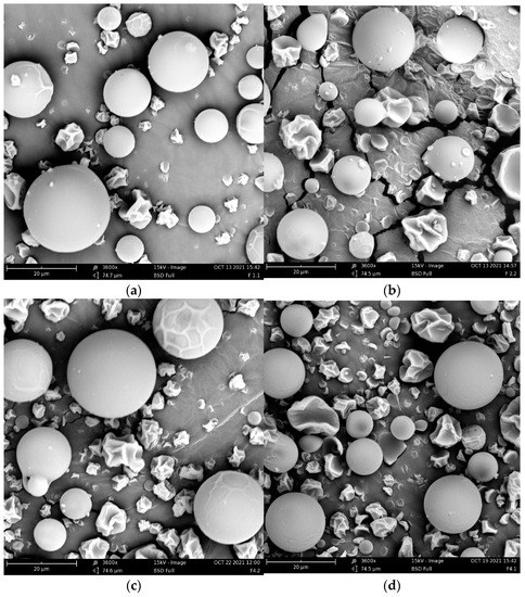 SEM images for image analysis of each formulation: (a) F1; (b) F2; (c) F3; (d) F4.