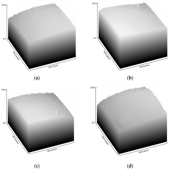 Surface plot graphs are presented in Figure 3. This type of plot is used to analyze the heterogeneity of the samples at a given crop size. At first glance, it can be seen how the formulations made with a concentration of 10 wt% (F1 and F2) presented a more homogeneous and smoother surface compared to those made with 15 wt% (F3 and F4). Similarly, powders that were prepared with soy protein have a more heterogeneous and irregular surface as they present more peaks.