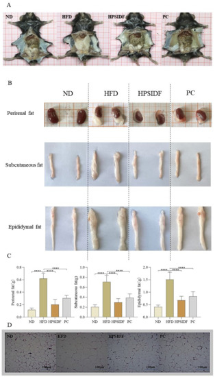 Effects of HPSIDF on fat accumulation in HFD−fed mice. (A) Intraperitoneal morphology of mice in each group. (B,C) Apparent morphology and weight of white adipose tissues. (D) Representative H&E staining images of epididymal fat tissue. ND—normal diet-fed group; HFD—high-fat diet−fed group; HPSIDF—high-fat diet plus HPSIDF (1000 mg/kg) fed group; PC—high-fat diet plus L-carnitine (40 mg/kg) fed group. In contrast to the HFD group, **** p < 0.0001.