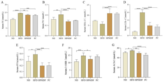 Effects of HPSIDF on serum biochemical factors in HFD−fed mice. (A–E) Serum TC, TG, HDL-C, LDL-C, and FFA contents. (F,G) Levels of 3-OHB and ACAC. ND—normal diet−fed group; HFD—high−fat diet−fed group; HPSIDF—high-fat diet plus HPSIDF (1000 mg/kg) fed group; PC—high−fat diet plus L−carnitine (40 mg/kg) fed group. Compared with the HFD group, * p < 0.05, ** p < 0.01, *** p < 0.001 and **** p < 0.0001.