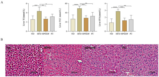 Effects of HPSIDF on hepatic steatosis in mice fed with HFD. (A) Levels of hepatic TC, TG and FFA. (B) H&E staining of the liver. ND—normal diet−fed group; HFD—high-fat diet−fed group; HPSIDF—high-fat diet plus HPSIDF (1000 mg/kg) fed group; PC—high−fat diet plus L−carnitine (40 mg/kg) fed group. Compared with the HFD group, * p < 0.05, ** p < 0.01, *** p < 0.001, and **** p < 0.0001.
