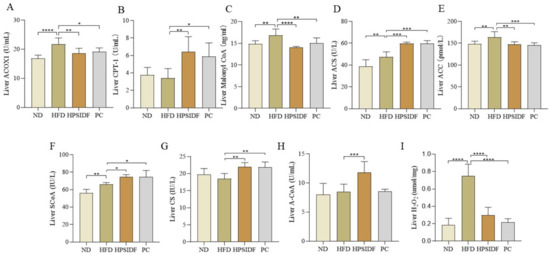 Effects of HPSIDF on the activity of enzymes related to hepatic fatty acid oxidation and the production of intermediate and final products in HFD−fed mice. Determination of ACOX1, CPT-1, Malonyl CoA, ACS, ACC, ScoA, CS, A-CoA, and H2O2 in the liver (A–I). ND—normal diet-fed group; HFD—high-fat diet−fed group; HPSIDF—high-fat diet plus HPSIDF (1000 mg/kg) fed group; PC—high-fat diet plus L−carnitine (40 mg/kg) fed group. In contrast to the HFD group, * p < 0.05, ** p < 0.01, *** p < 0.001, and **** p < 0.0001.