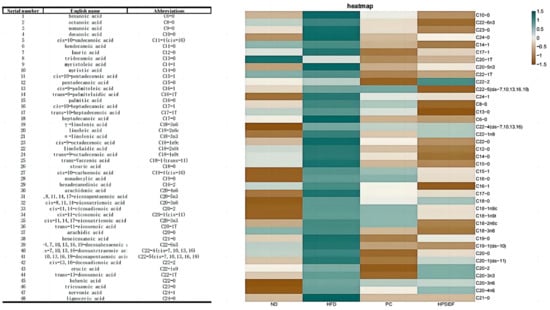 As shown in Figure 5, long term HFD leads to the accumulation of hexanoic acid (C6:0), octanoic acid (C8:0), decanoic acid (C10:0), palmitic acid (C16:0), stearic acid (C18:0), behenic acid (C22:0), tricosanoic acid (C23:0), lignoceric acid (C24:0), cis-10-pentadecenoic acid (C15-1), cis-10-pentadecenoic acid (C18-1n9c), trans-9-octadecenoic acid (C18-1n9t), cis-8,11,14-eicosatrienoic acid (C20-3n6), cis-7,10,13,16,19-docosapentaenoic acid (DPA) (C22-5), cis-4,7,10,13,16,19-docosahexaenoic acid (C22-6n3) and nervonic acid (C24-1) in the liver. After HPSIDF intervention, the contents of hexanoic acid (C6:0), octanoic acid (C8:0), decanoic acid (C10:0), lauric acid (C12:0), myristic acid (C14:0), palmitic acid (C16:0), heptadecanoic acid (C17:0), stearic acid (C18:0), tricosanoic acid (C23:0), lignoceric acid (C24:0), myristoleic acid (C14-1), cis-10-pentadecenoic acid (C15-1), cis-10-heptadecanoic acid (C17-1), linoleic acid (C18-2n6c), γ-linolenic acid (C18-3n6), cis-11-eicosenoic acid (C20-1), trans-11-eicosenoic acid (C20-1T), cis-11,14-eicosadienoic acid (C20-2), cis-11,14,17-eicosatrienoic acid (C20-3n3), cis-8,11,14-eicosatrienoic acid (C20-3n6), cis-5,8,11,14,17-eicosapentaenoic acid(EPA) (C20-5n3), arachidonic acid (C20-4n6), trans-13-docosenoic acid (C22-1T), cis-13,16-docosadienoic acid (C22-2), cis-7,10,13,16,19-docosapentaenoic acid (DPA) (C22-5), nervonic acid (C24-1) were memorably reduced in HFD-fed mice. Thus, the HPSIDF intervention significantly promoted the oxidation of medium- and long-chain fatty acids in HFD-fed mice.