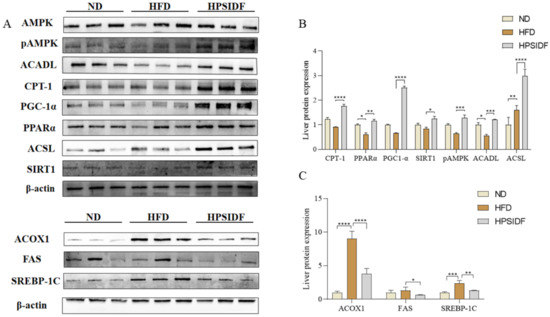 As shown in Figure 6A, several key enzymes for fatty acid β-oxidation were determined in the liver. Long-term HFD markedly upregulated the expression levels of ACSL (p < 0.01), ACOX1 (p < 0.0001), and SREBP-1c (p < 0.001), while downregulating the levels of PPARα (p < 0.05) and ACADL (p < 0.05) in contrast to the ND group. However, these changes were reversed by HPSIDF intervention, except for the ACSL levels, which were downregulated (p < 0.0001). Moreover, HPSIDF treatment observably upregulated the expression levels of CPT-1 (p < 0.0001), PGC-1α (p < 0.0001), SIRT1 (p < 0.05), and pAMPK (p < 0.001), and downregulated the expression levels of FAS (p < 0.05) in contrast to the HFD group.