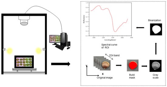 Typically, several techniques are now available to determine the quality of chestnuts, including machine vision [4], near-infrared spectroscopy (NIR) [1], and computed tomography (CT) [3]. Machine vision technology is widely used to detect damage on the surface of agricultural products, but damage to chestnuts often occurs internally, and cannot be detected by machine vision technology when damage occurs inside the chestnut. Good results were obtained using X-ray–CT chestnut defect experiments [3,5]. For example, the accuracy of identifying healthy, severely, and slightly defective chestnuts was 0.929, 0.937, and 0.836, respectively [5]. However, it cannot yet be applied to large-scale chestnut identification and production classification because CT requires theoretical analysis by professionals, which is costly and inefficient. In addition, HIS has a unique advantage over X-ray–CT in that it can represent changes in reflectance in the near-infrared range as data in the form of images [6]. The optical properties of chestnuts vary from quality to quality, and even small changes in the diffuse reflectance coefficient due to optical properties can be detected directly. This technique is more sensitive to slight changes in chestnut quality than X-ray–CT using HIS. NIR has been combined with the chemometric approach for chestnut quality classification [1], where the highest accuracy of 0.96 was achieved using the linear discriminant analysis (LDA) model, but NIR combined with the chemometric approach was not as efficient as the HSI technique for detection.