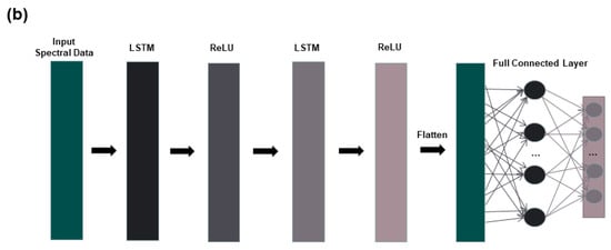 The long short-term memory network (LSTM) is a special kind of recurrent neural network (RNN) that solves the general recurrent neural network long-term dependency problem [32]. LSTM can perform a single operation across all sequence lengths and optimize vanishing gradient problems through its gating features [33]. T Due to the advantages of the LSTM model, it has also been more widely used in the field of spectroscopy in recent years [9,34]. The LSTM model in this study is shown in Figure 2. The LSTM model consists of an input layer, two LSTM layers, and one fully connected layer. Among them, ReLU is chosen for the activation function, thus speeding up the learning speed and avoiding the problem of vanishing gradients. The deep learning model in this study is executed in MATLAB R2022a (Mathworks, Natick, MA, USA).