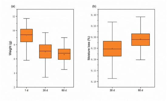 The study found that the moisture content of chestnuts decreased as the number of storage days increased, and the rate of moisture loss was significantly faster during the first 30 days than the last 30 days. Measurements taken of the weight of fresh, sub-fresh, and rotten chestnuts led to this conclusion. The weight change and water loss of chestnuts increased with the increase of storage days, as shown in Figure 3, and water loss slows down for 30–60 days, probably because the chestnut mold develops during this period and mold multiplies rapidly [35]. The average weight of chestnuts decreased by 2.68 g after 60 days of storage at room temperature, and the average moisture loss was 29.1%, which also indicated that there was a large difference in the moisture of rotten chestnuts stored for a long time compared to fresh chestnuts.