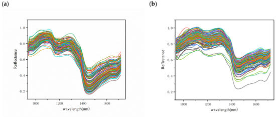 The average spectra of the different chestnut qualities are presented in Figure 4, with the spectral wavelength range in the NIR band (935–1720 nm). In general, the three different qualities of chestnuts have the same spectral curve waveforms with similar peaks and troughs, but different reflectance values due to the consistent internal composition of the chestnuts [22]. Among them, the sub-fresh and rotten chestnuts showed a more scattered spectral curve, which may be due to the different degrees of quality variation in these chestnuts.