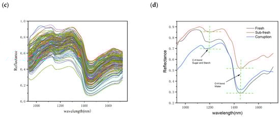 Reflectance spectra of different quality chestnuts: (a) fresh chestnuts; (b) sub-fresh chestnuts; (c) rotten chestnuts; (d) average spectrum.