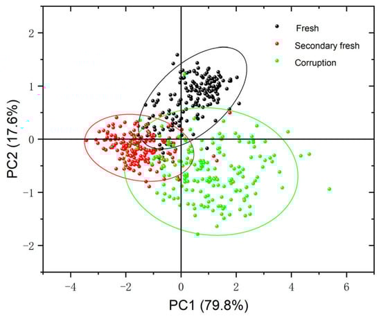 Before building the model, the raw spectral data were visualized and qualitatively clustered using PCA. Since the cumulative contribution of the first two principal components (PC1, PC2) reached 97.4%, with PC1 explaining 79.8% of the variance and PC2 explaining 17.6% of the variance, PC1 and PC2 were chosen to explain the clustering analysis of the chestnut spectral data. As shown in the scatter plot of PCA scores in Figure 5, the distribution of the three chestnut species can be effectively separated using confidence ellipses. There is a certain degree of overlap between fresh chestnuts and sub-fresh chestnuts, and a small overlap between sub-fresh chestnuts and rotten chestnuts, which may be caused by the different change rates of different chestnuts.