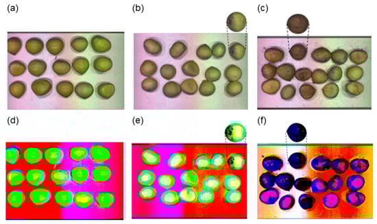 Sample raw images and principal component images: (a) fresh chestnuts; (b) sub-fresh chestnuts; (c) rotten chestnuts; (d–f) images of the first 3 principal components of the corresponding quality chestnut.