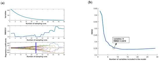 Hyperspectral data are characterized by a strong correlation between adjacent bands and high redundancy [22]. Appropriate use of feature-extraction methods can effectively reduce the dimensionality of the spectral data and simplify the model. In this study, three feature-extraction algorithms were used: competitive adaptive reweighted sampling (CARS), the successive projections algorithm (SPA), and the uninformative variable elimination (UVE). SPA is a forward-selection algorithm designed for selecting spectral features. It selects the least redundant band from the original spectrum in order to reduce the effect of spectral covariance [23]. CARS is a feature-selection method that combines Moncatello sampling (MC) and partial least-squares (PLS) model regression, and this approach uses cross-validation (CV) for determining the subset with the lowest root-mean-square error [24]. The equation for root-mean-square error cross validation (RMSECV) is as follows: