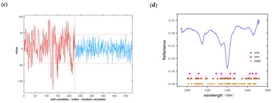 Important wavelength extraction results: (a) CARS algorithm; (b) SPA algorithm; (c) UVE algorithm; (d) important wavelength distribution.