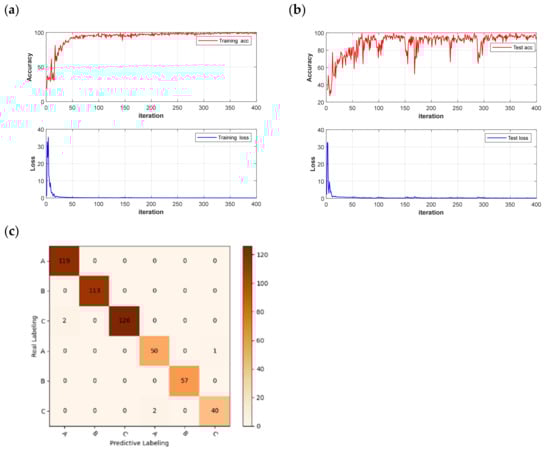 Model results and confusion matrix: (a) CNN training set accuracy and loss function; (b) CNN test set accuracy and loss function; (c) FD-UVE-CNN model confusion matrix.