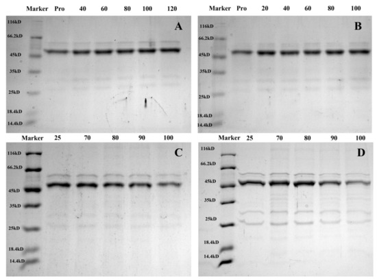 2.16. SDS–PAGE Polyacrylamide Gel Electrophoresis