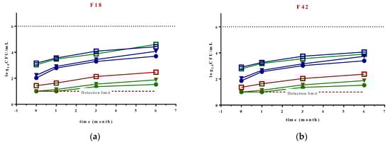 Evaluation of the total aerobic psychrophiles (blue), Enterobacteriaceae (red), and yeast and mold (green) counts (expressed in Log10 CFU/mL) in a fermented beverage of O. ficus-indica cultivar ‘Rossa’ (red pulp) (a) fermented during 18 h (F18) and (b) fermented during 42 h (F42) (non-pasteurized—□, pasteurized with high-pressure—●, pasteurized with temperature—▼; unsuitable for consumption (6.0 log)—••••, and ---- below the detection limit). Samples of Enterobacteriaceae for both HPP and thermal pasteurization are not represented in the graphics, as values were below the detection limit (1.0 log). Results are expressed as the average ± SD (n = 3).
