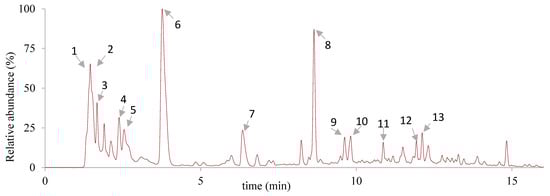 Chromatogram of Opuntia ficus-indica cv ‘Rossa’ juice fermented for 42 h after high-pressure pasteurization, at 280 nm, by UHPLC-DAD-ESI-MSn. Peak numbers correspond to those represented in Table 5. The chromatograms of the remaining samples present high similarity to this one and are not shown.