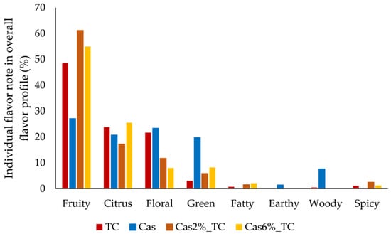 Contribution of individual flavor notes in the overall flavor profile of tart cherry juice (TC), protein matrix (Cas) and formulated aggregates (Cas2%_TC and Cas6%_TC).