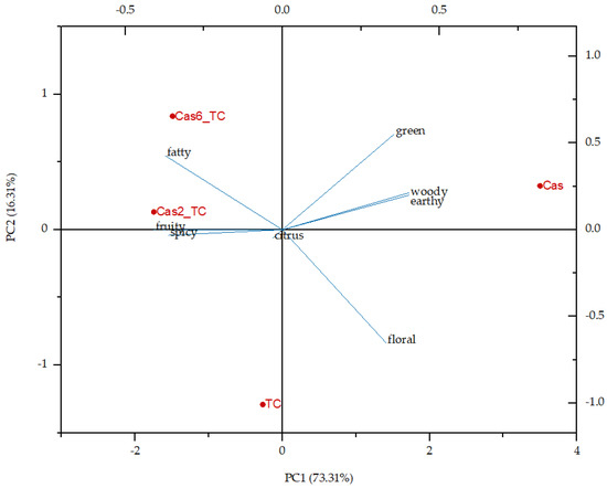 Principal component analysis of individual flavor notes in the overall flavor profile of tart cherry juice (TC), protein matrix (Cas) and formulated aggregates (Cas2_TC and Cas6_TC—aggregates with 2% and 6% of protein matrix).