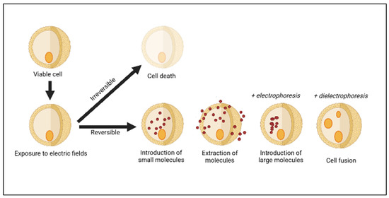 Generally, two mechanisms have been suggested for cell inactivation by PEF, namely electrical breakdown and electroporation [18]. Electrical breakdown occurs when the PEF achieves a greater electric field strength than the critical field strength of the microorganism, resulting in direct discharge and the breaking down of the cell membranes [42]. The biological cells are an electrolyte enclosed by an electrically injured membrane, which is exposed to an extrinsic electric field and subsequently induces transmembrane voltage [38]. The possible outcomes of cell electroporation are shown in Figure 1. Electroporation is the process of temporarily weakening the lipid bilayer and proteins of the cell membranes, resulting in the transformation of cell membrane permeability and the subsequent draining of the membrane [43,44]. It can be reversible or irreversible, depending on the PEF processing parameter, medium constituents, type, and size of the cells [14]. PEF has been used in a variety of food processing applications such as meat processing [45] and the retention of bioactive compounds from fruits and vegetables [46]. Although irreversible, PEF is used for microbial and enzyme inactivation in liquid foods such as milk and fruit juices [30,47].