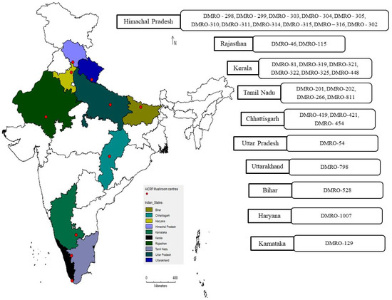 Thirty-three strains of C. indica were procured from the culture bank, ICAR-Directorate of Mushroom Research (ICAR-DMR), Solan, Himachal Pradesh, India. These strains were collected and deposited in the culture bank of ICAR-DMR by different research organizations affiliated with the All India Coordinated Research Project (AICRP) mushroom network spread over different states of India viz. Karnataka, Rajasthan, Uttar Pradesh, Kerala, Tamil Nadu, Haryana, Chhattisgarh, Bihar, Himachal Pradesh, and Uttarakhand (Figure 1). To maintain the cultures, malt extract (20 g) and agar (20 g) (HiMedia, Mumbai, India) were mixed in one litre distilled water (pH-7.0) followed by autoclaving (121 °C, 30 min.), sub-culturing and incubation at 32 ± 2 °C at ICAR-DMR culture bank [28]. A temperature of 16 ± 1 °C was maintained for long-term storage of the cultures.